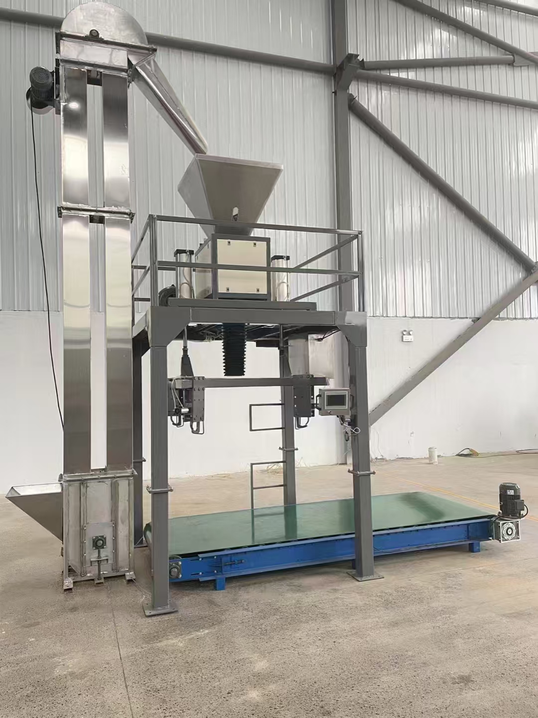粉末定量噸包機采用單/雙螺旋強制給料控制系統,無級變頻調速控制給料速度,快速給料由大小螺旋快速進料,慢速給料由小螺旋精加料完成,結合精度控制閥實現包裝速度和精度的自動控制,性能穩(wěn)定可靠。灌裝時只需人工掛袋,給定信號后,便可完成自動灌裝、自動計量、滿稱時自動停機、松袋的工作循環(huán), 由叉車或輸送機直接輸出后吊裝儲運。