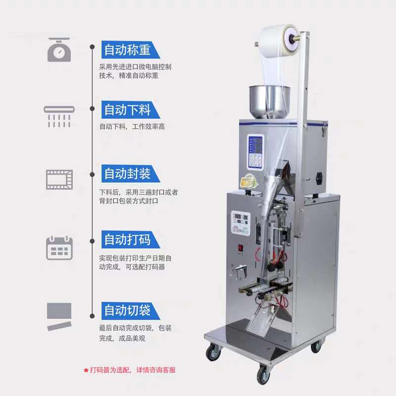 上海鑄衡工廠直銷顆粒物料自動包裝機是我司熱賣系列產品之一,是各種食品定量包裝的理想設備,機器采用全不銹鋼機身,堅固耐用,穩定性好,是您創業的好幫手。適合于膨化食品、薯片、蝦條、糖果、巧克力、小餅干、花生、瓜子、大米、種子、開心果、咖啡豆、青豆、茶葉、果凍、速凍餃子、湯圓、雞精、白砂糖、食鹽等散粒狀物料的自動化包裝。